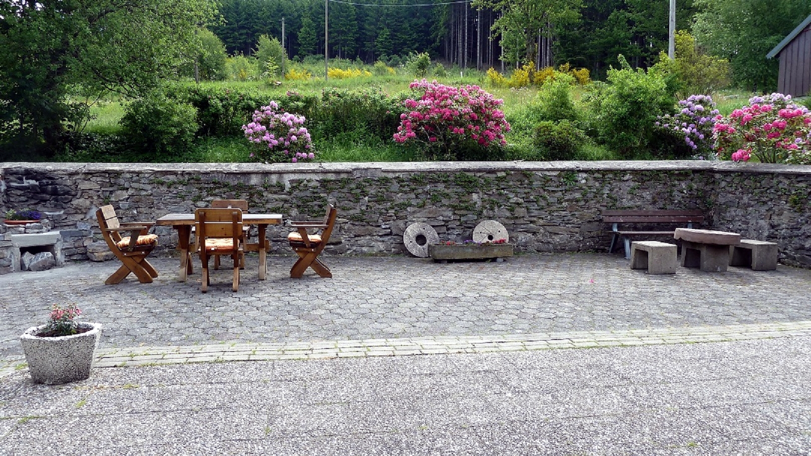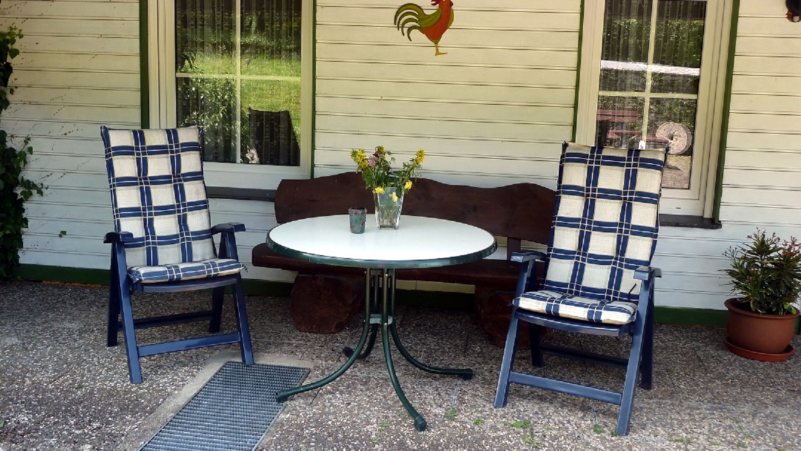 Vor der Wohnung „Fuchs“ können Sie sich auf einer großzügigen Terrasse mit schönen, gemütlichen Sitzecken, die teilweise auch überdacht sind, aufhalten und entspannen.